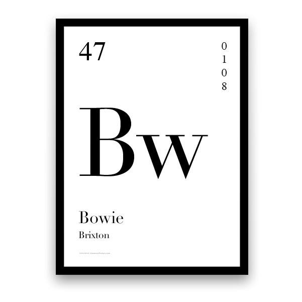 David Bowie nació el 8 de Enero de 1947 en Brixton. Con esos datos hemos creado su “elemento químico” en este póster que ahora puedes comprar en nuestra tienda. Mucho más que un músico. Pocos artistas han sido tan influyentes como él.